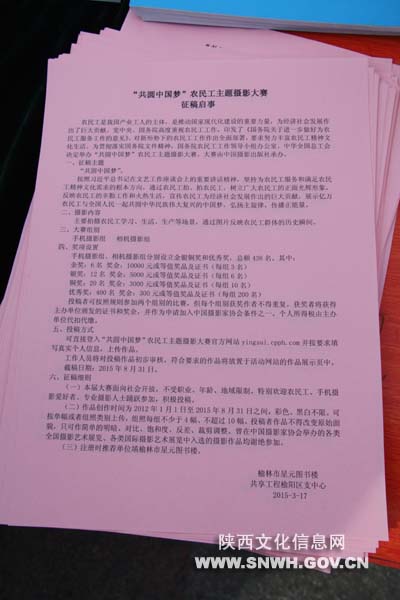 接陕西省人力资源和社会保障厅转发国务院农民工工作领导小组办公室《关于举办“共圆中国梦”农民工主题摄影大赛的通知》(国家工办发[2015]7号)文件。为确保大赛顺利开展,进一步丰富农民工精神文化生活。共享工程榆阳区支中心接到通知后,按陕西省分中心要求积极开展宣传活动。