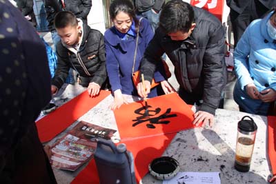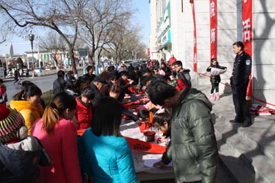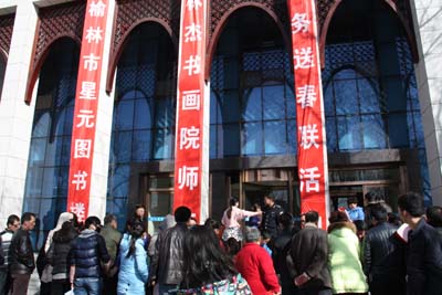 春节是中华民族的传统节日,贴春联是春节的传统习俗。为弘扬中华传统文化,营造欢乐、喜庆、祥和的春节氛围,榆林市星元图书楼2015年2月12日(农历腊月二十四)开展“迎春送祝福 网聚中国心”义务送春联活动,免费为广大城乡群众现场书写春联,送出新年祝福。